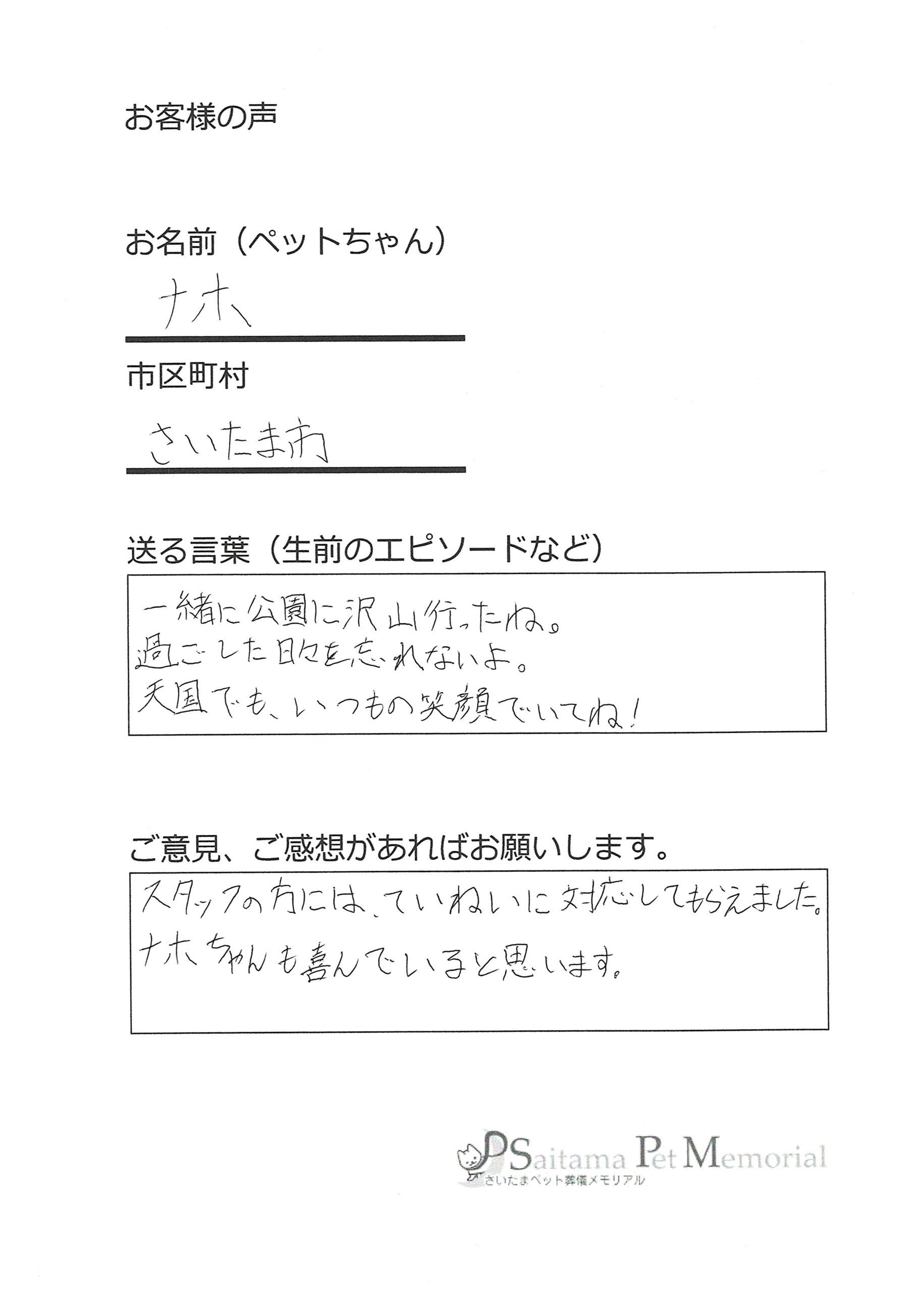 スタッフのかたには丁寧に対応いただきました。なほちゃんも喜んでいると思います